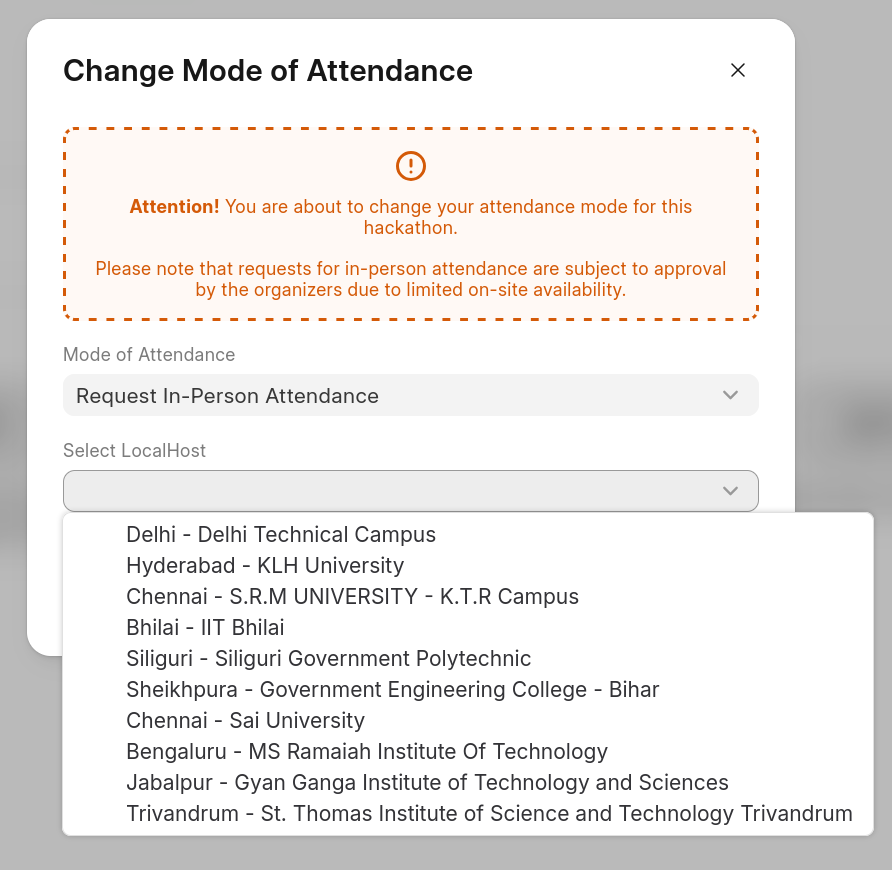 If you request to attend in-person then select the localhost you'd like to apply for. You will only be able to attend if localhost accepts your request, Please wait for localhost to accept or reject (you'll receive email on same). They get to see your git repo for evaluating themselves, so please keep it updated.